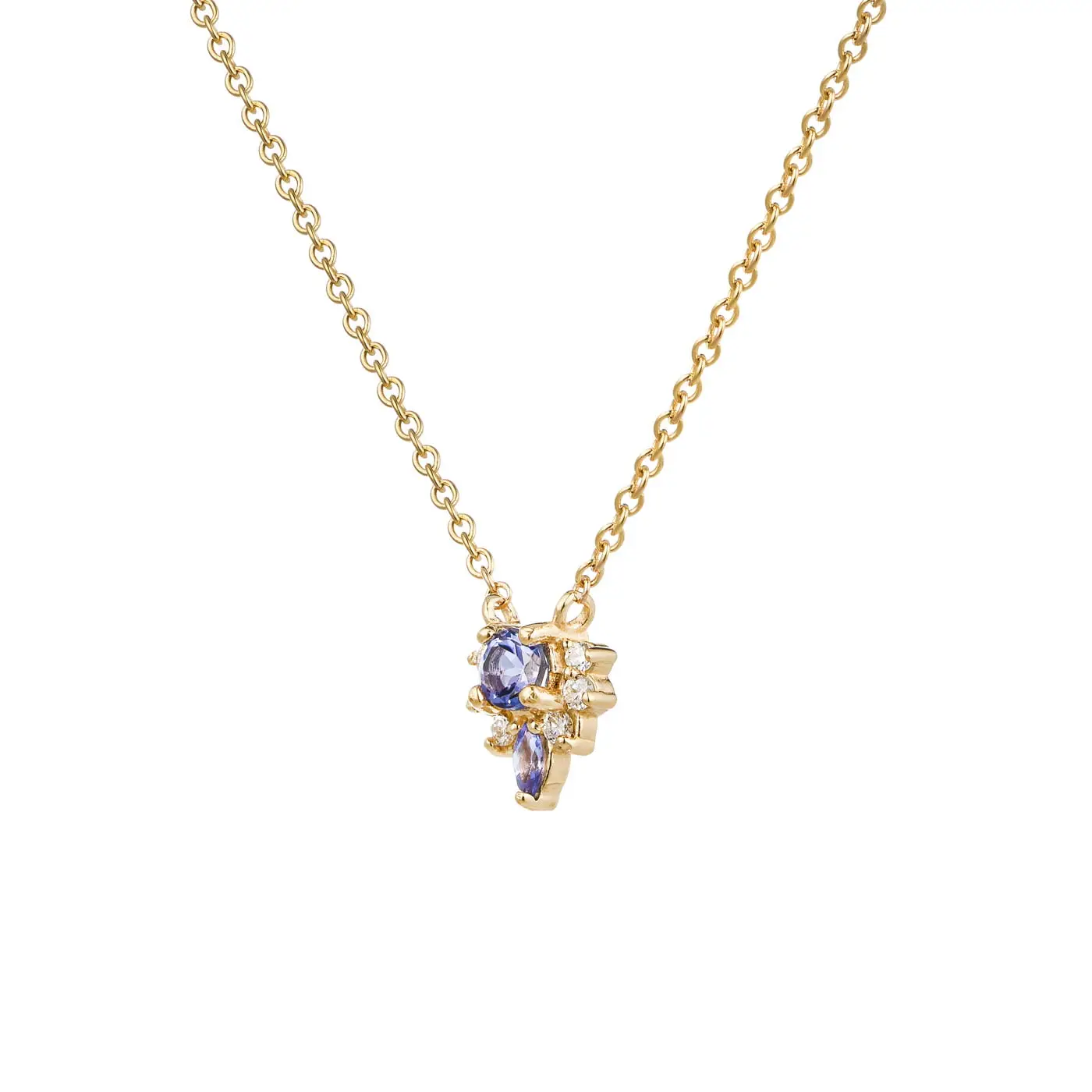 This exquisite necklace embodies the delicacy of a lotus flower, featuring a central tanzanite gem, symbolizing purity and rebirth. Surrounding diamonds add a subtle brilliance, while a graceful marquise-shaped tanzanite completes the harmony, creating a jewel that reflects the elegance and strength of nature.